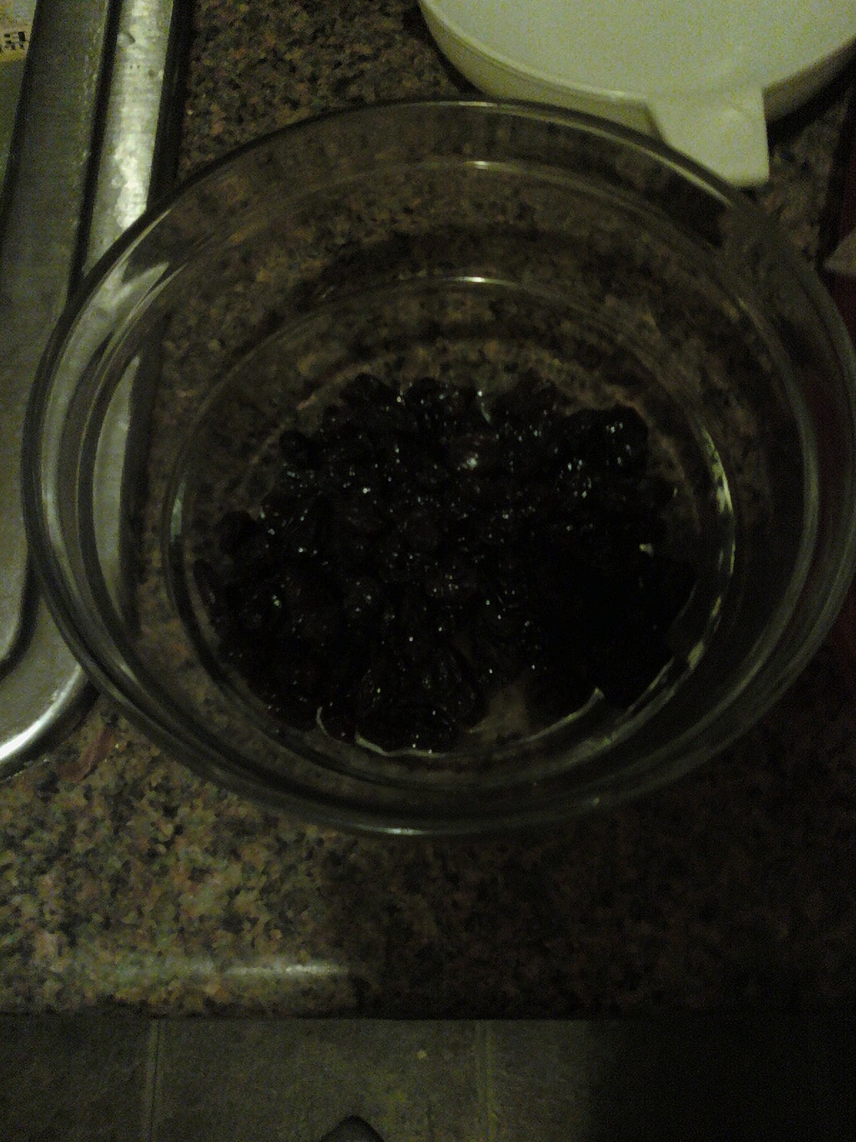 First, the raisins. In a small bowl, measure out 2 oz of raisins, and then soak them in about two or three tablespoons of whiskey until you're ready for them.
